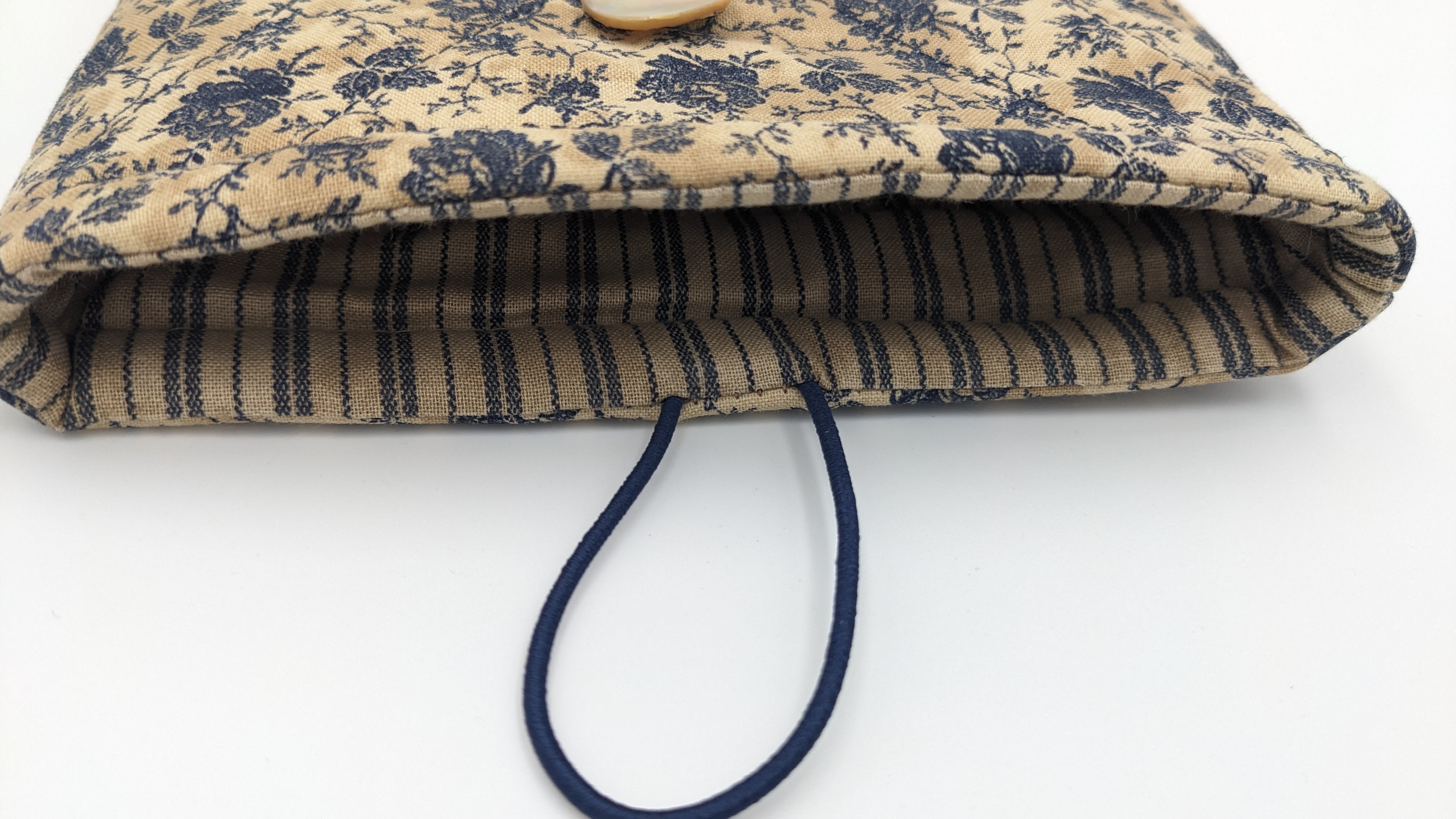 Small quilted book sleeve made to fit original small paper back books and more has an elastic and mother of pearl shell button for closure.