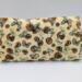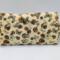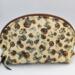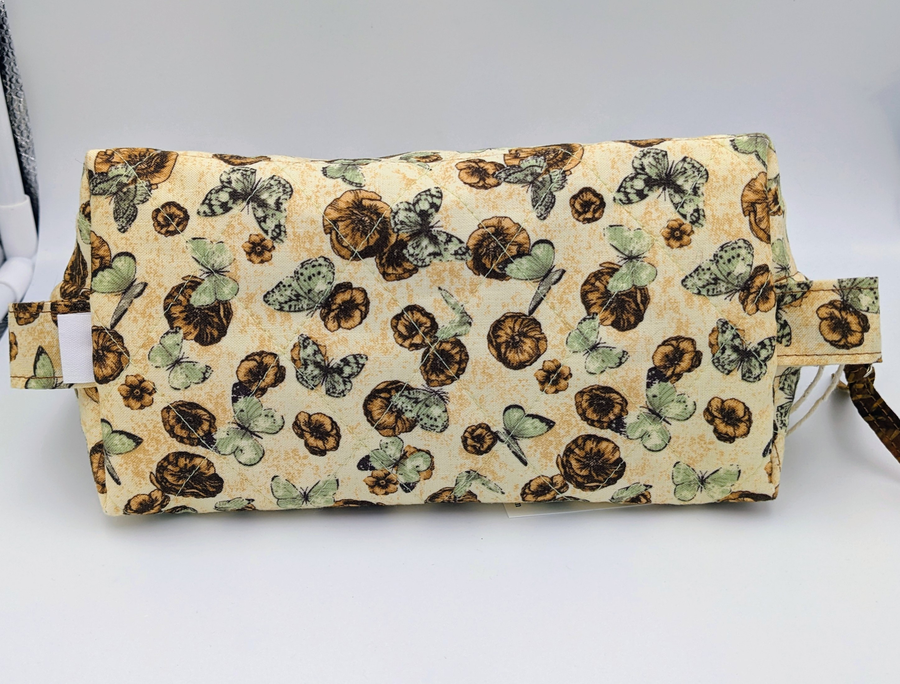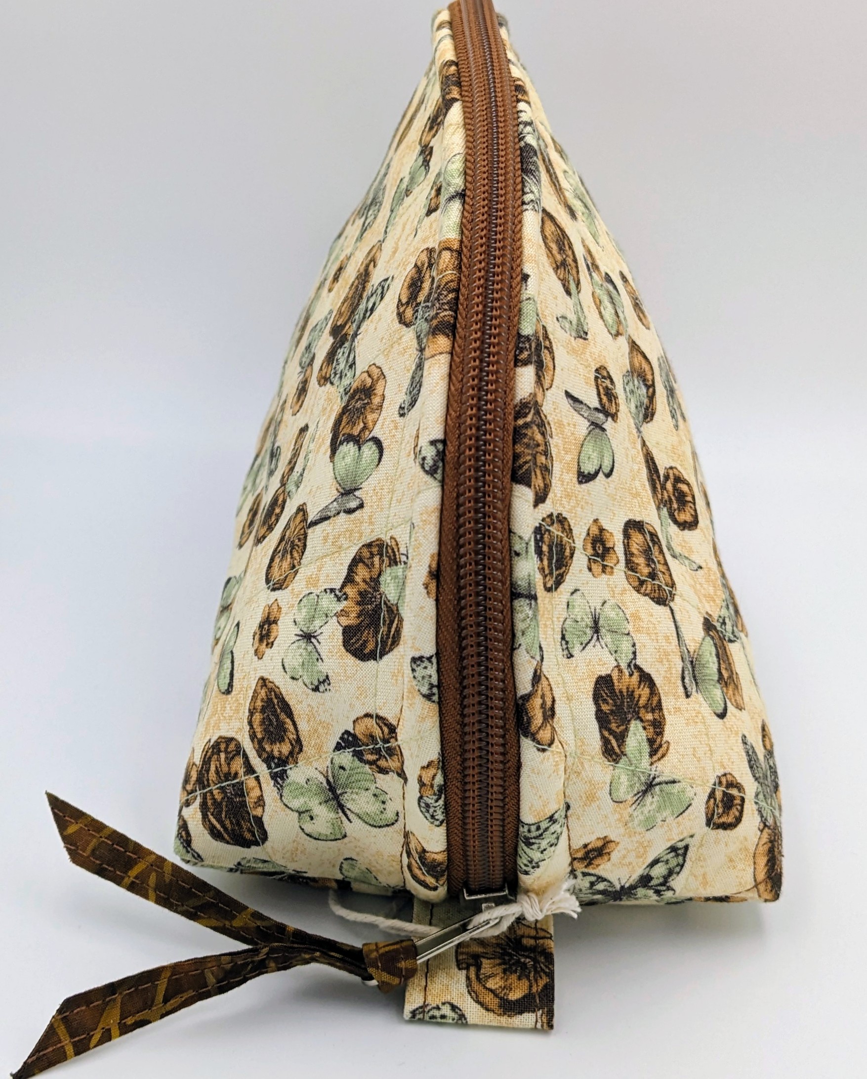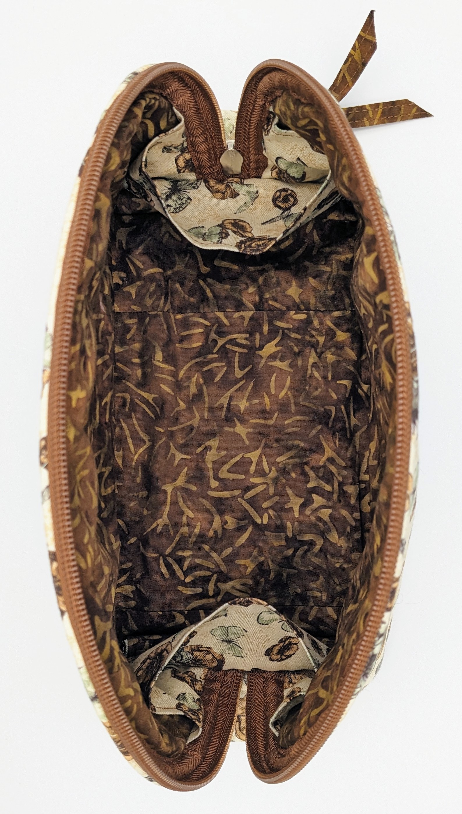 This extra large quilted zipper pouch has been made in a cotton fabric of coffee colored flowers and sage green butterflies on a beige mottled background. The lining is a bronze, rust coordinated batik print.