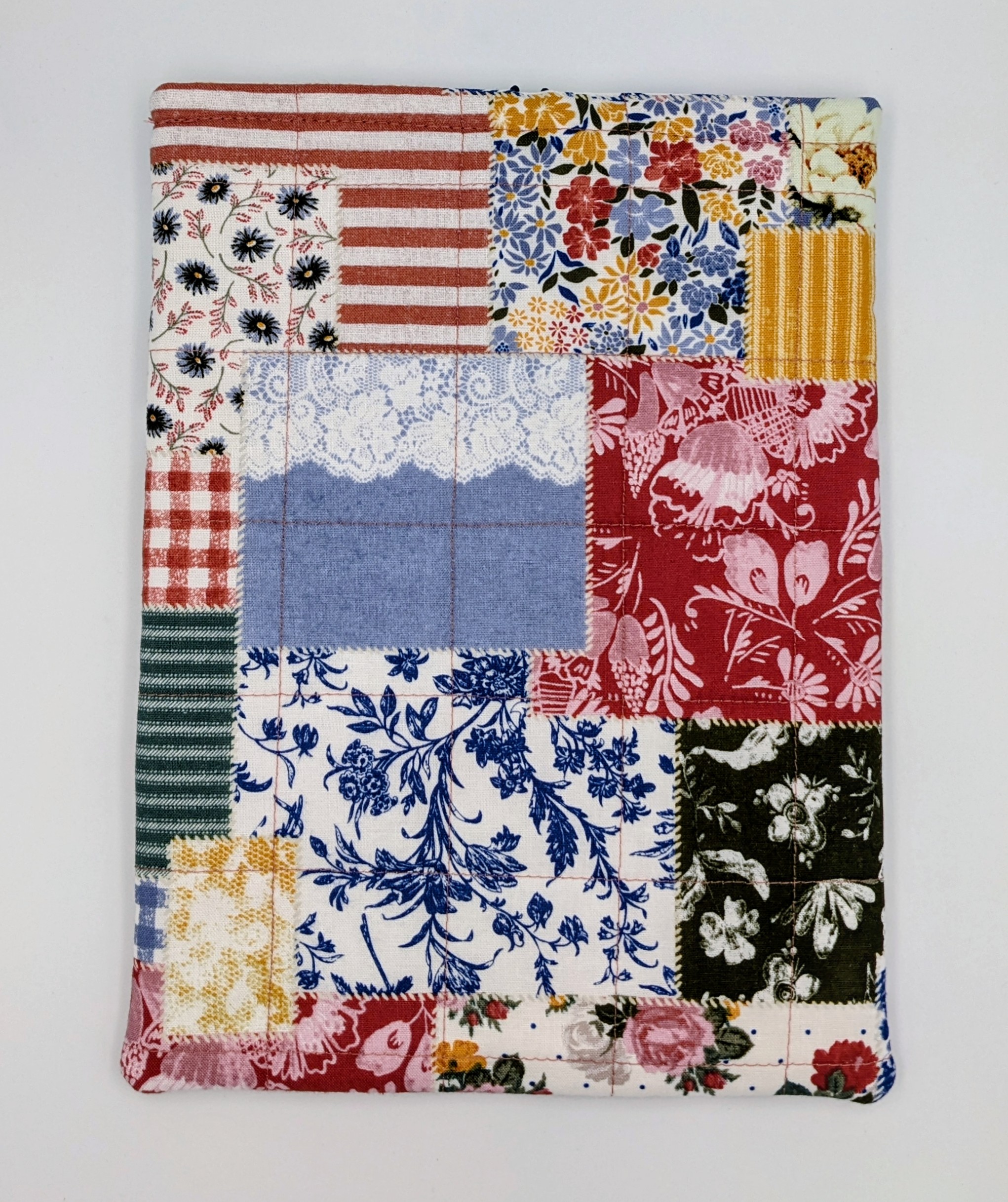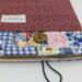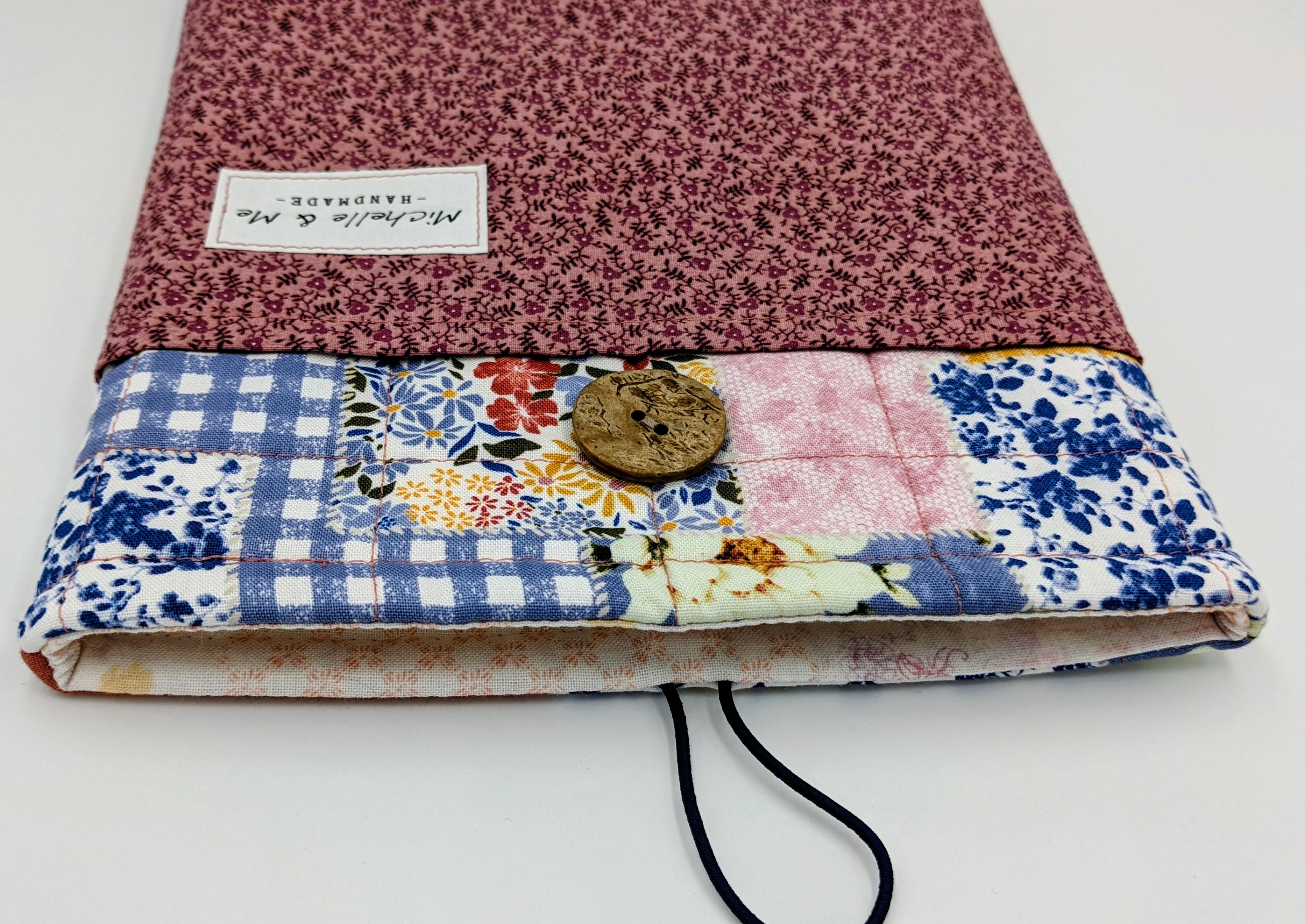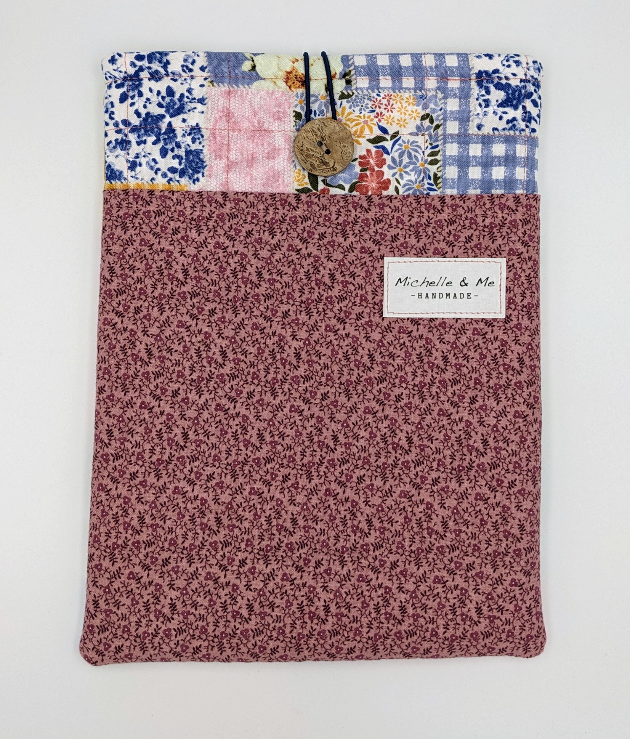 Beautiful soft colors of pink, light blue, pale green, and mauve in a delightful patchwork style cotton fabric on this cute book sleeve. The pocket on the front is of vintage calico cotton. The lining is of a very soft blush and off white printed cotton. Elastic and coconut shell button closure.