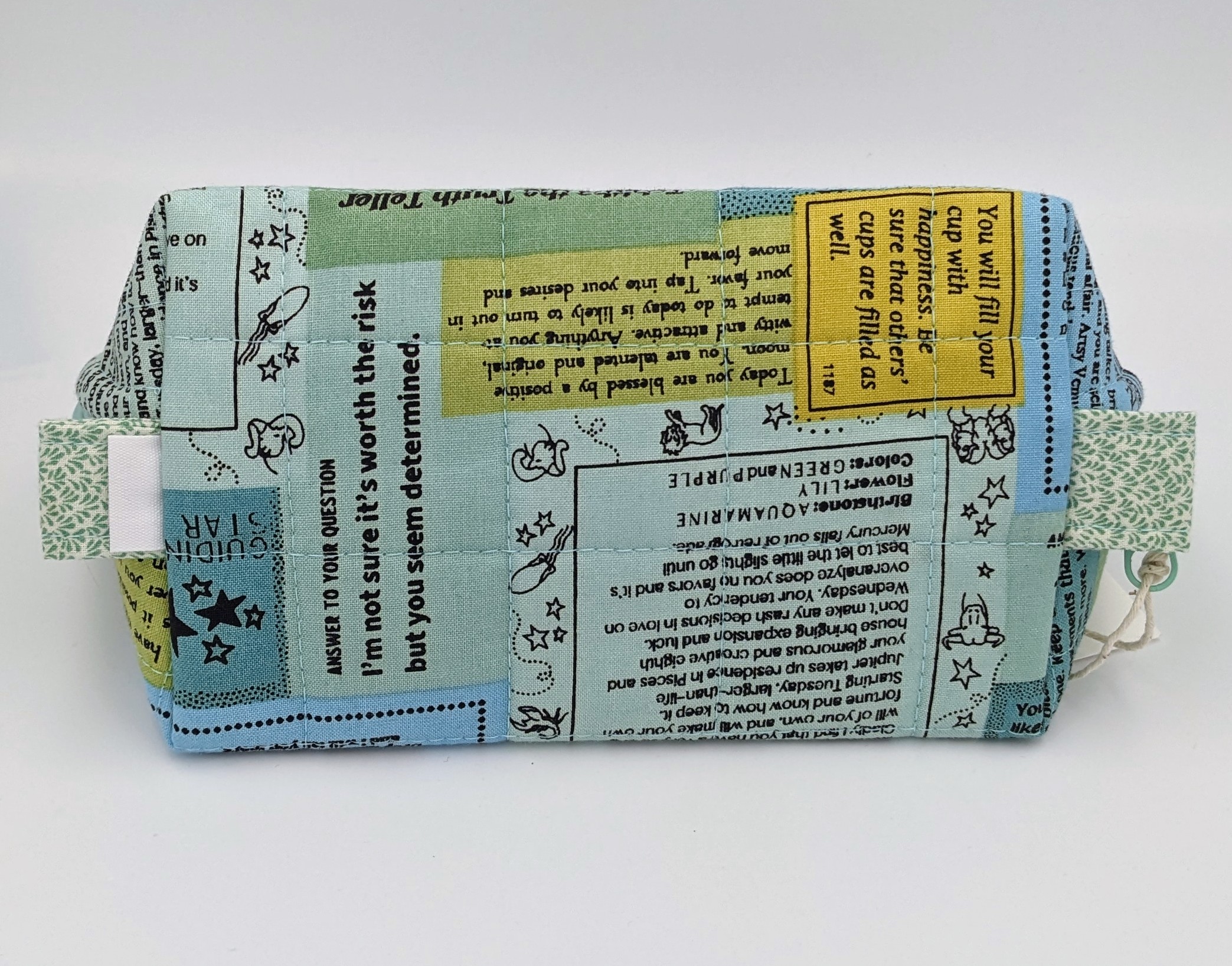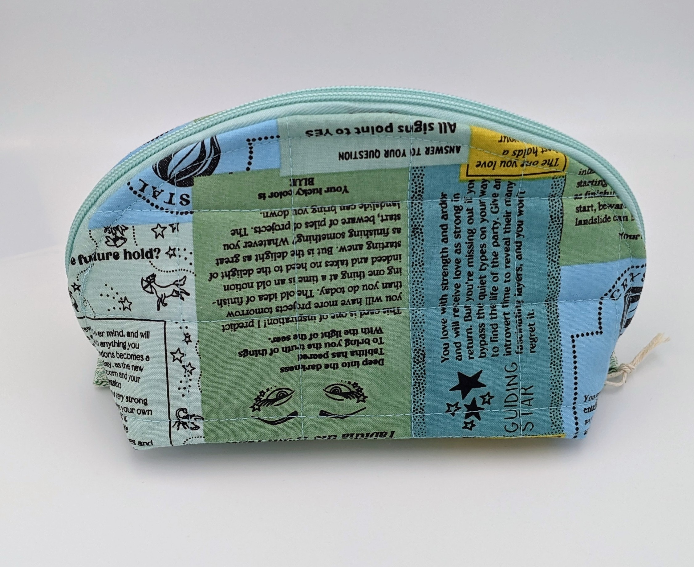 This large quilted zipper pouch was made in a metaphysical sayings cotton fabric of light blue, turquoise and pale green. The lining is a pale turquoise solid cotton.