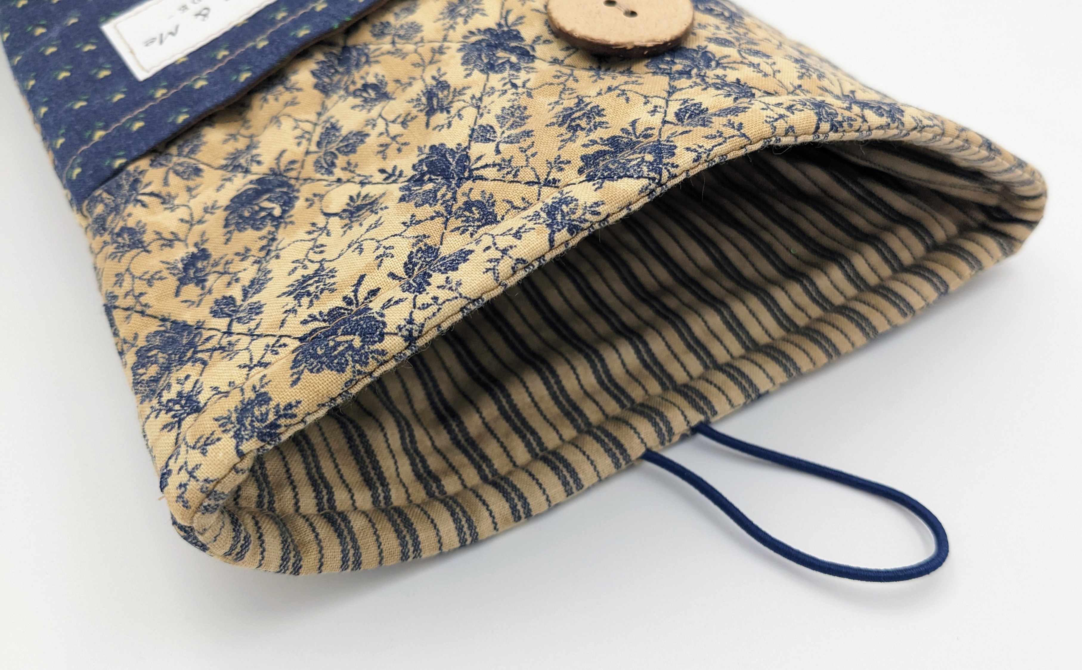 Perfect gift for the avid reader among you. Rich, old world style tea-stained muslin cotton fabric with navy blue flowers on the outside and vintage navy calico with tiny hearts for the pocket. The lining is a coordinating striped navy tea-stained pattern cotton. Elastic and coconut shell button closure.