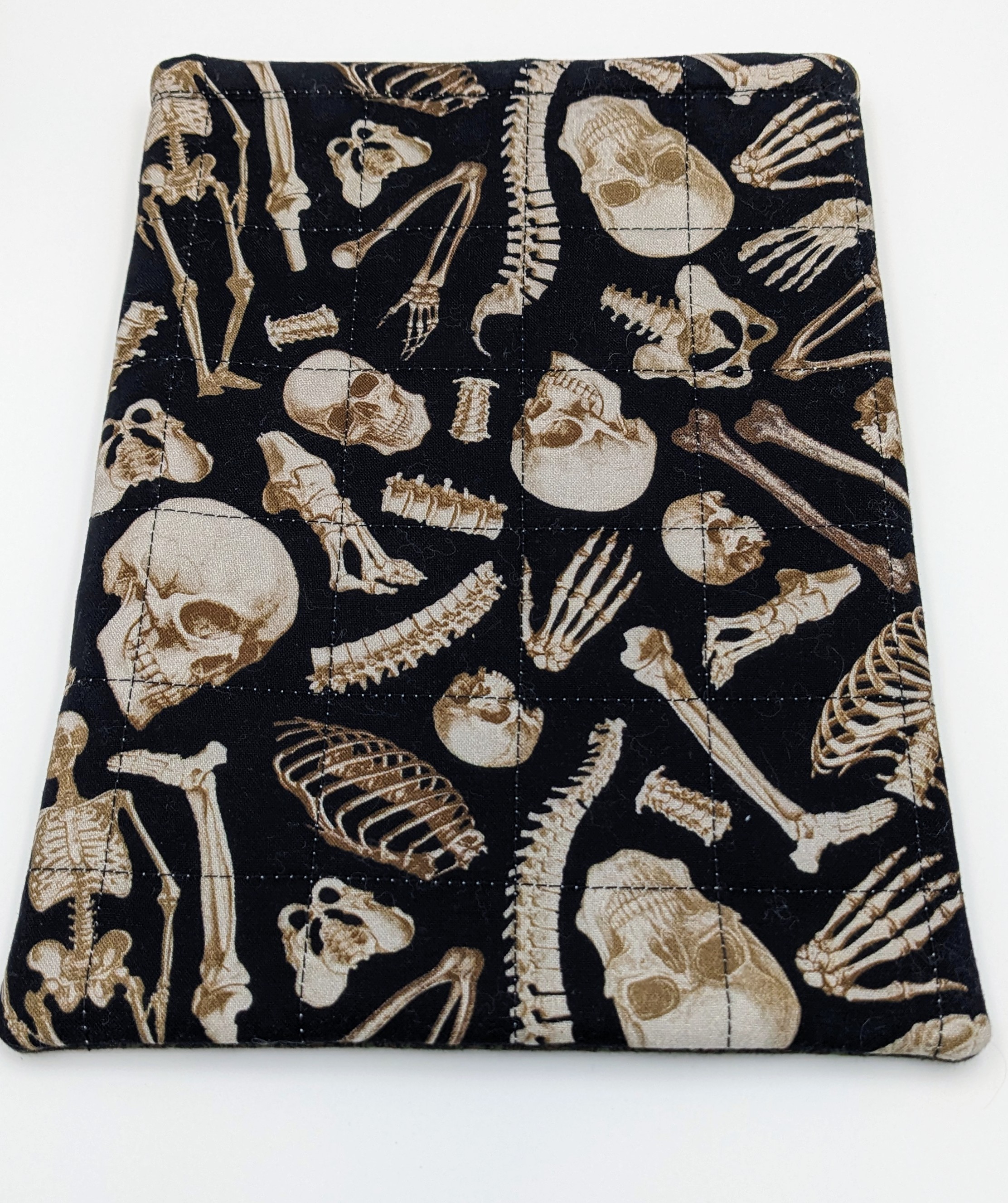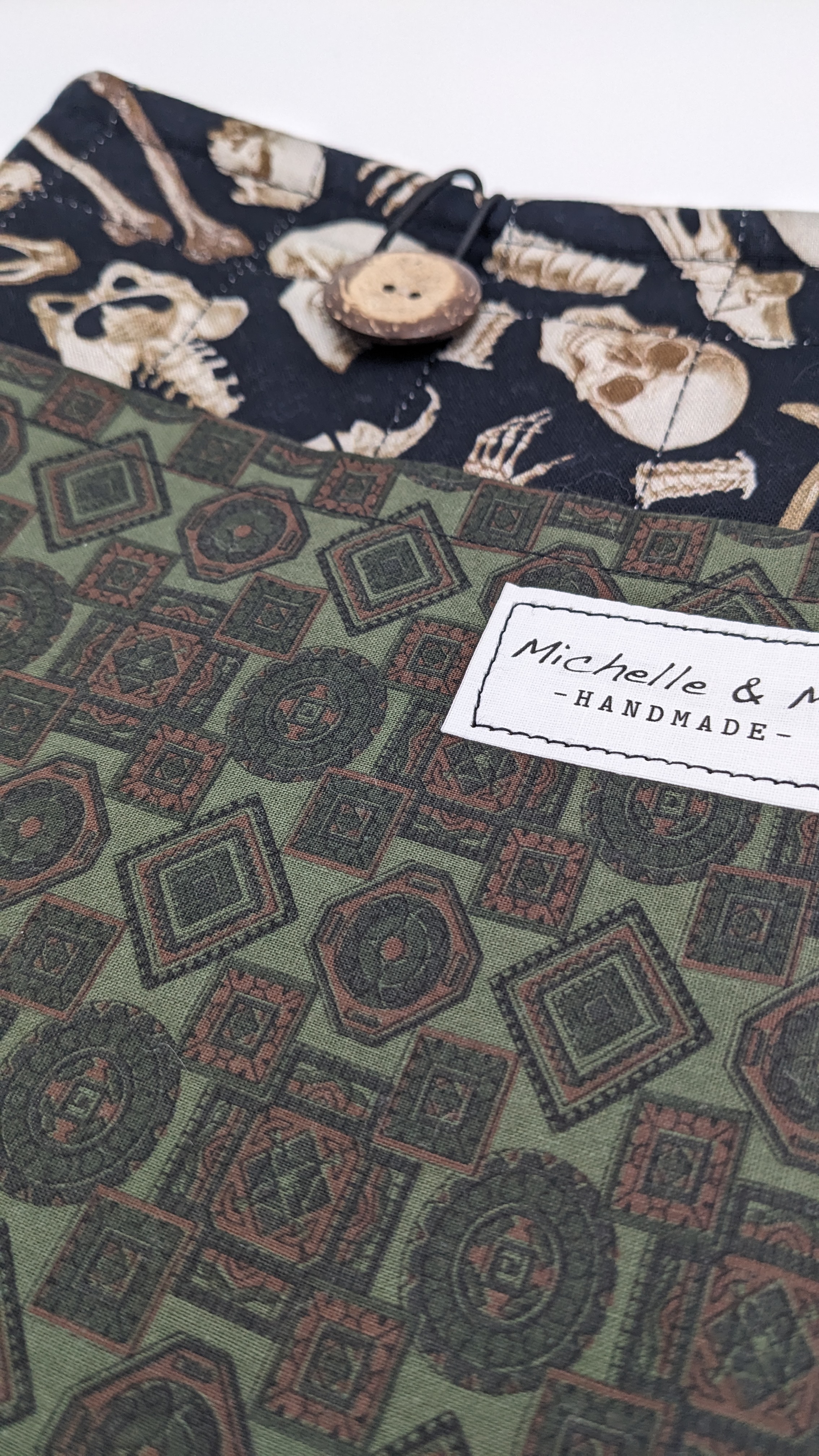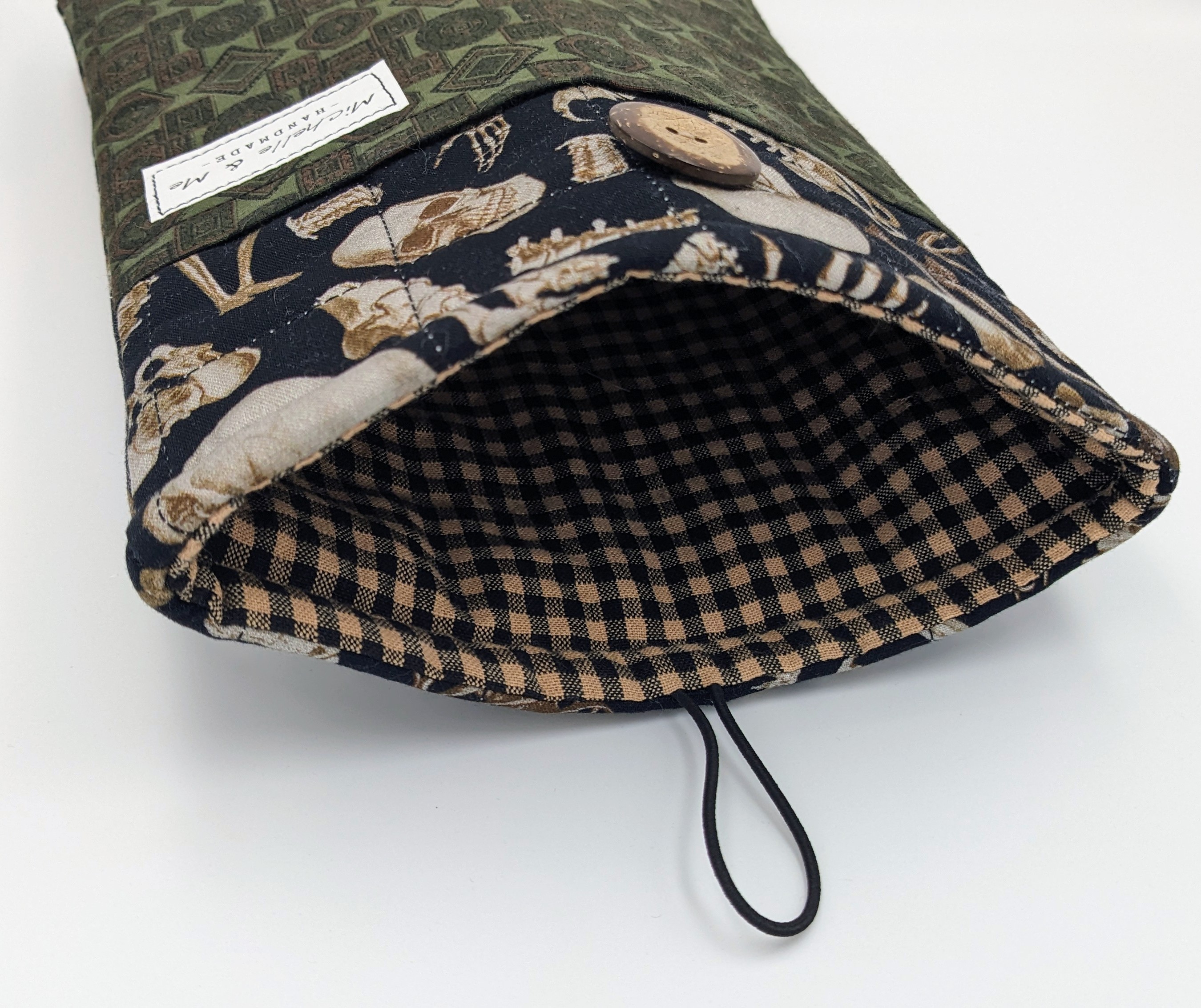 Perfect gift for the true crime reader among you. Anatomical human skeleton cotton fabric on front and back with dark green old-house-looking-wallpaper cotton fabric for the pocket. The lining is of a black and tan check cotton. Elastic and coconut shell button closure.