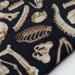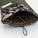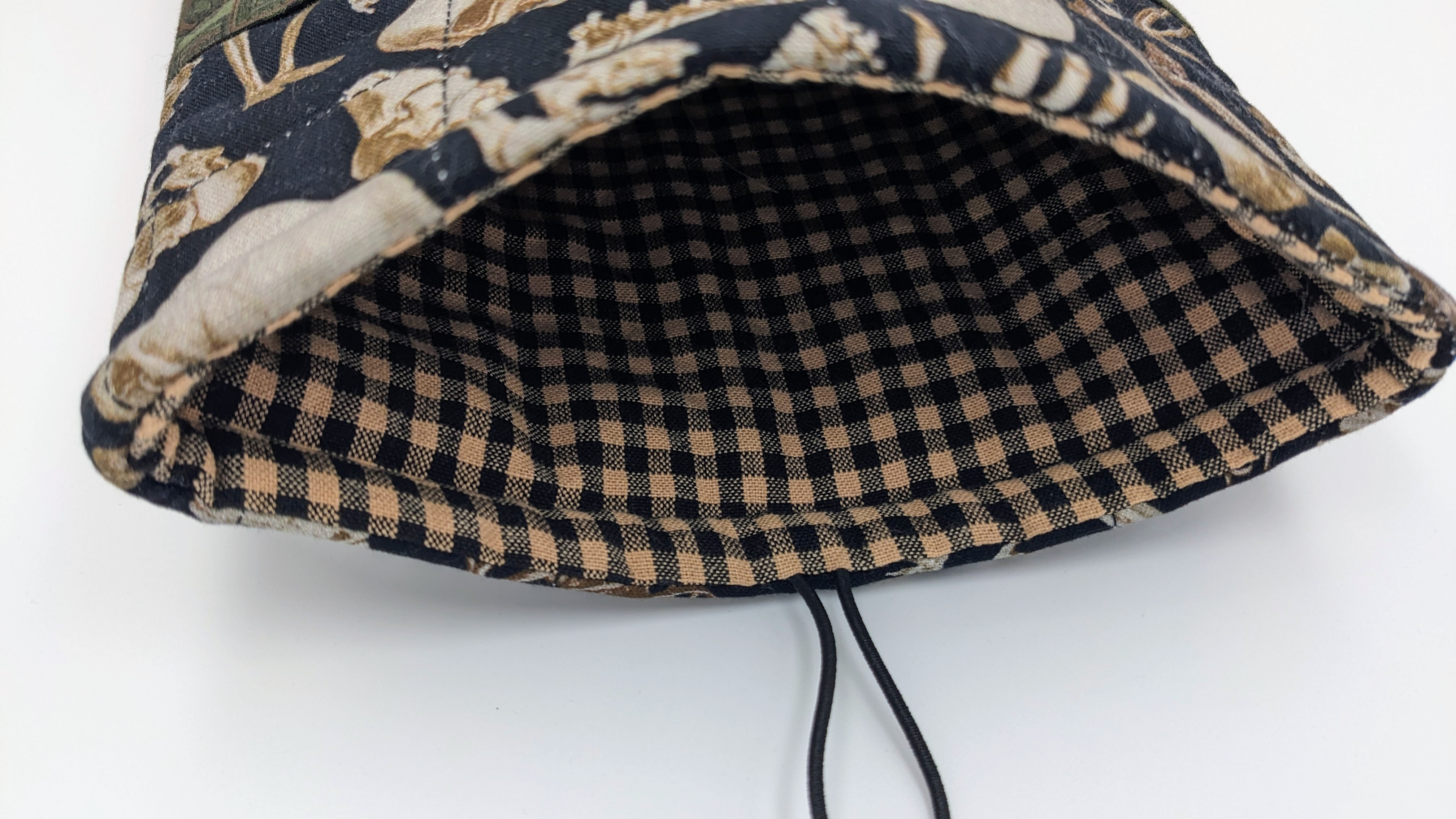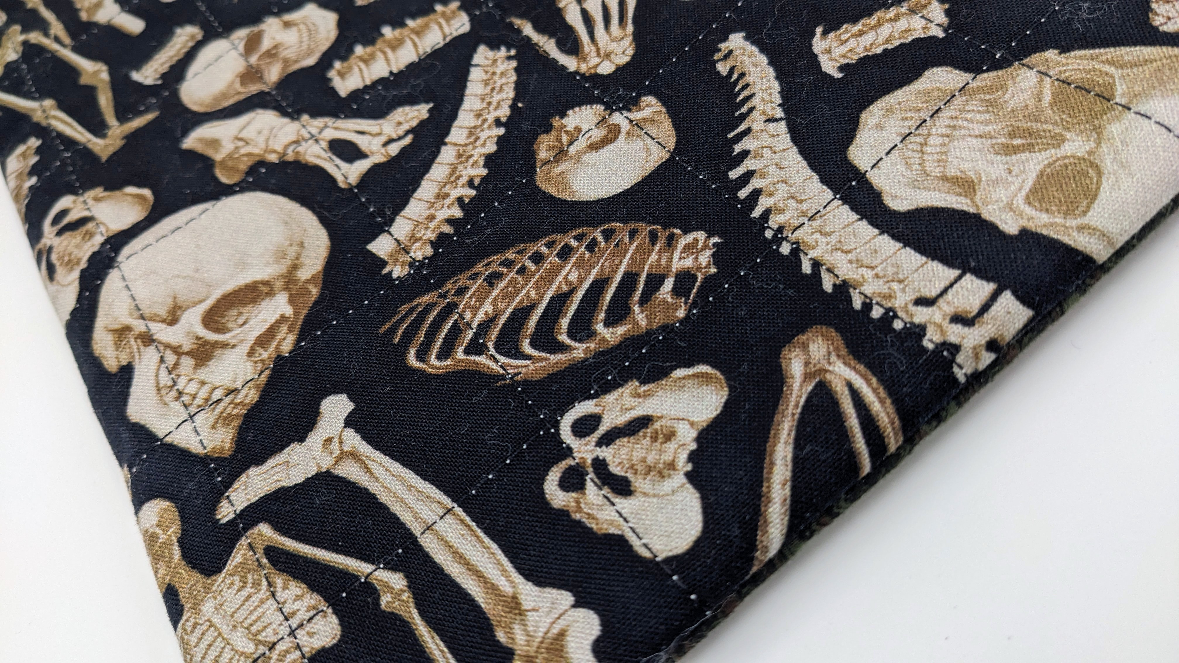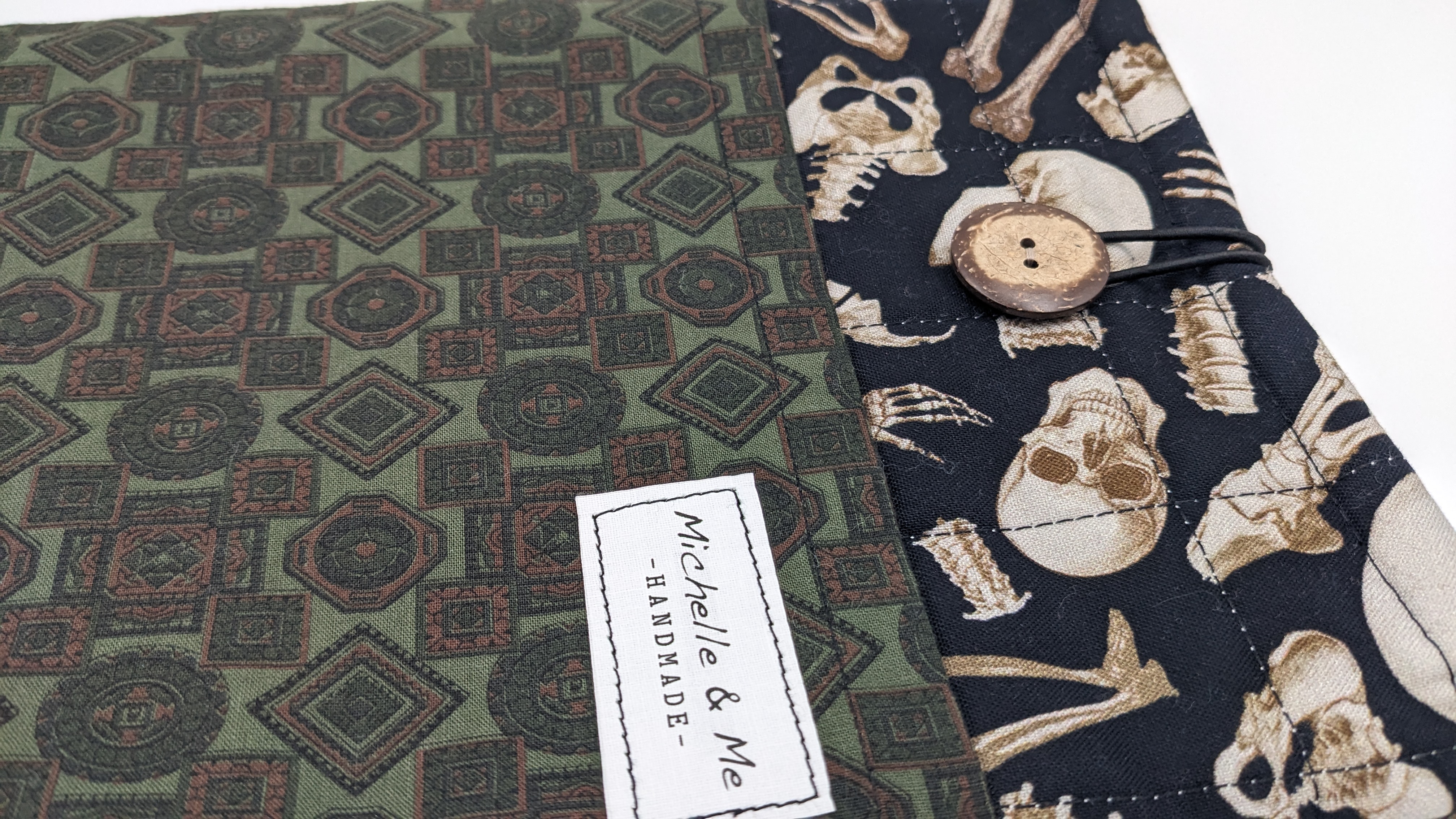 Perfect gift for the true crime reader among you. Anatomical human skeleton cotton fabric on front and back with dark green old-house-looking-wallpaper cotton fabric for the pocket. The lining is of a black and tan check cotton. Elastic and coconut shell button closure.